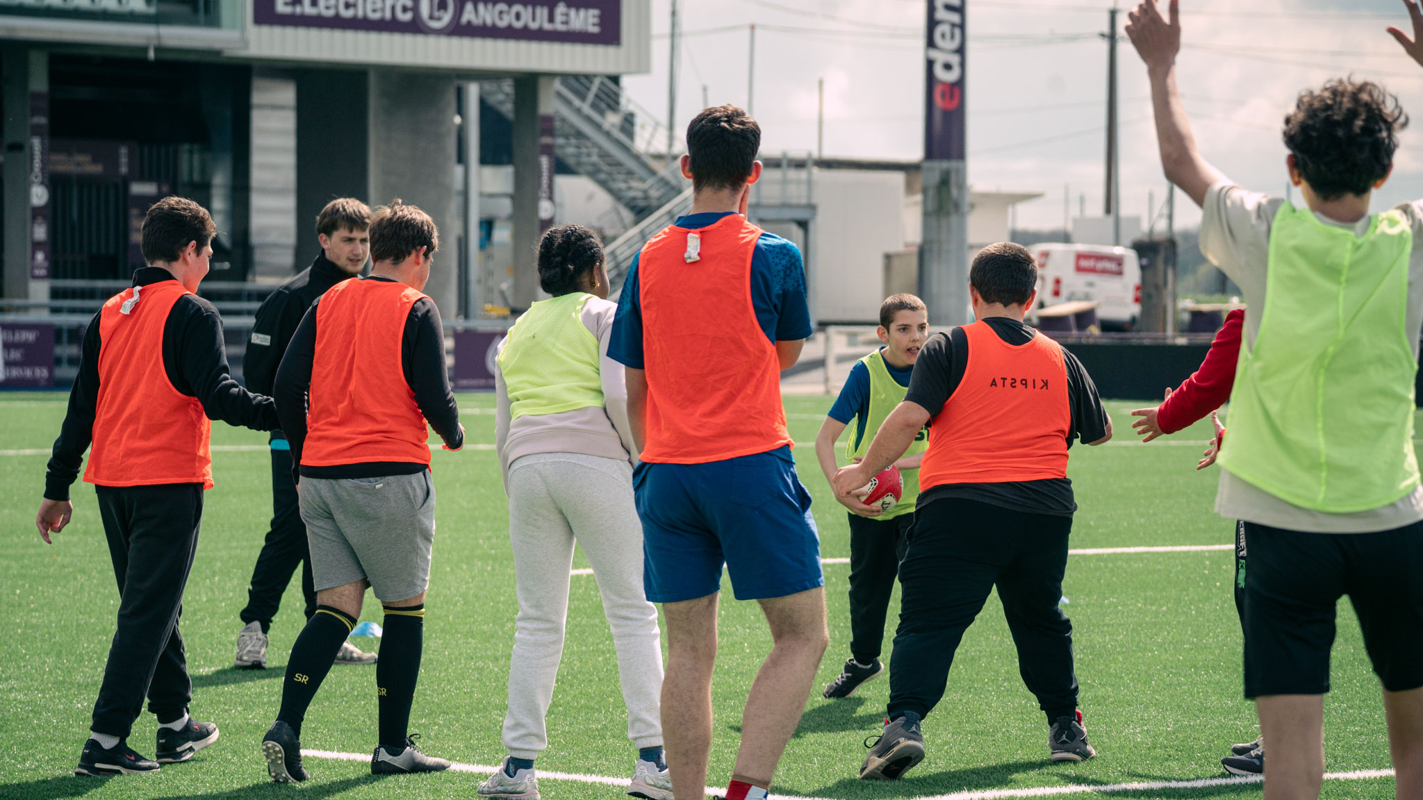 Après une pause déjeuner bien méritée, les 40 jeunes des établissements médico-sociaux étaient rejoins par une vingtaine de jeunes collégiens afin de participer à différents ateliers autour du rugby organisés sur le terrain des joueurs du SA XV.